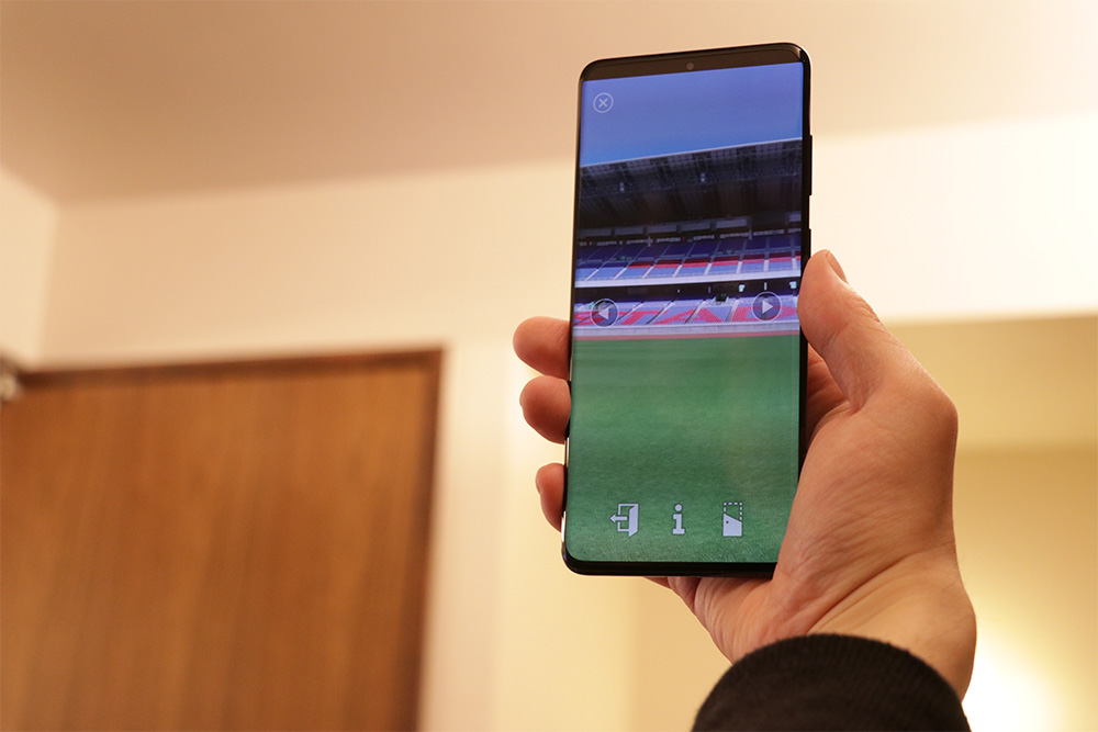 そのドアをタップして開き、室内を歩いて中に入るとピッチの中央に移動し、実際のスタジアムを360°渡せる再現空間に入場できる。コロナ禍で多くのファンがスタジアムに入れない中、自宅からスタジアムに入ることができ、試合前のスタジアムの臨場感を味わえるようにしたわけだ。