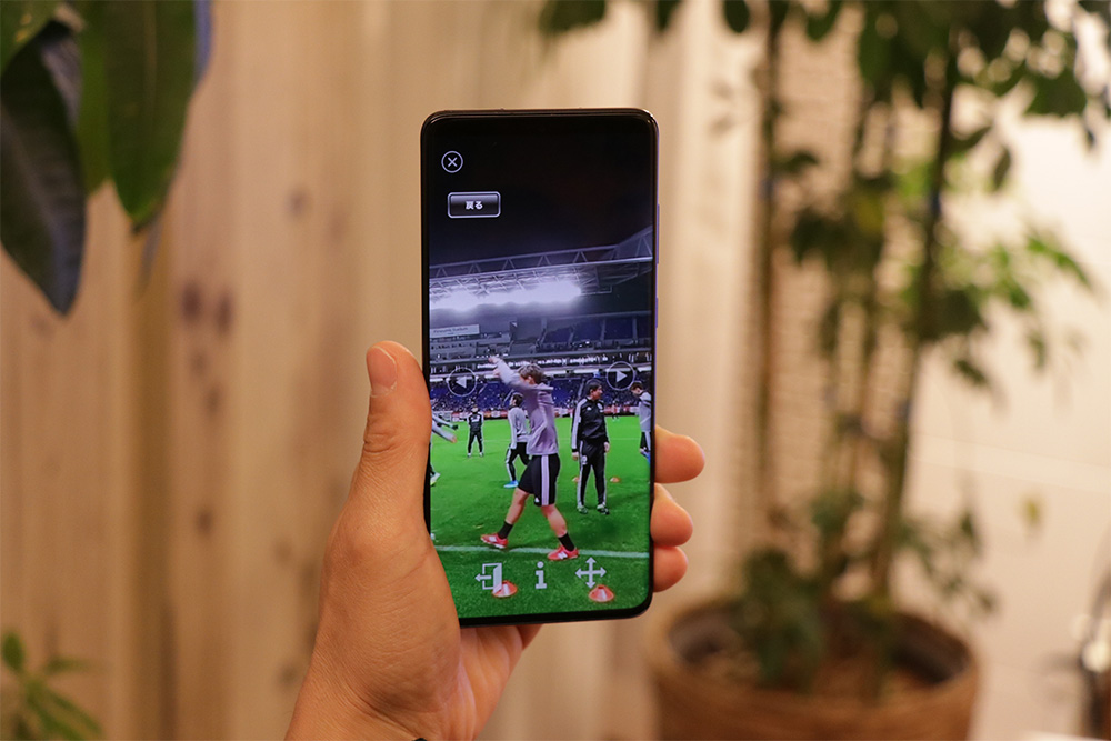 「U-24日本代表」の試合だけで提供された練習風景映像は、大会直前の合宿の様子をドキュメンタリータッチで構成。今の時期に日本国内で試合が開催できることに対して感謝の気持ちを込めたメッセージが伝えられていた。さらに、試合直前のウォーミングアップも5Gでライブ配信。360°映像なので、スマートフォンを動かしながら、まるで代表チームの一員になったかのような没入感が得られた。