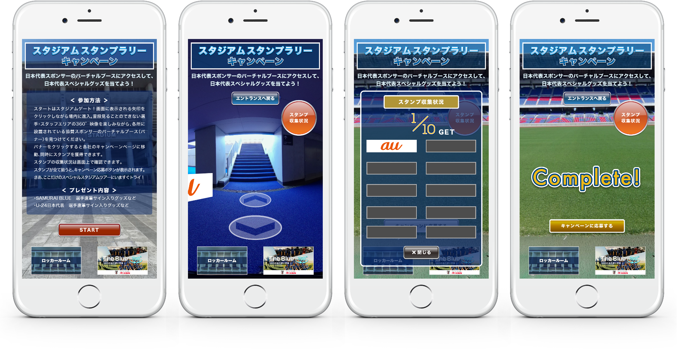 「スタジアムスタンプラリー」は、バーチャルスタジアム内に設置されたサッカー日本代表スポンサー各社のブースに訪問し、獲得できるスタンプをすべて集めると日本代表スペシャルグッズが当たるキャンペーンに応募できるというもの。